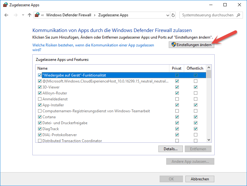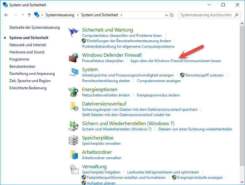 Wählen Sie unter "Windows Defender Firewall" den Unterpunkt "Apps über die Windows-Firewall kommunizieren lassen".