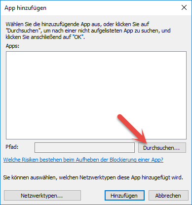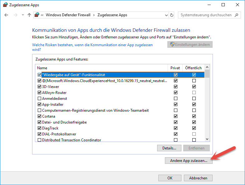 Im unteren Bereich des nächsten Fensters können Sie nun über "Andere App zulassen" Änderungen an dieser Liste vornehmen.