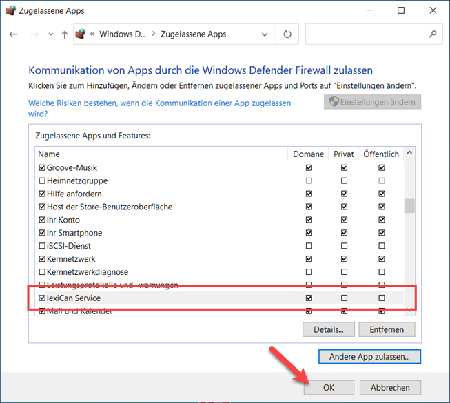 Legen Sie nun fest für welche Netzwerkkonfiguration die Freigabe gelten soll (Domäne, Privat, Öffentlich) und schließen Sie die Änderung der Firewall-Einstellungen über "OK" ab.