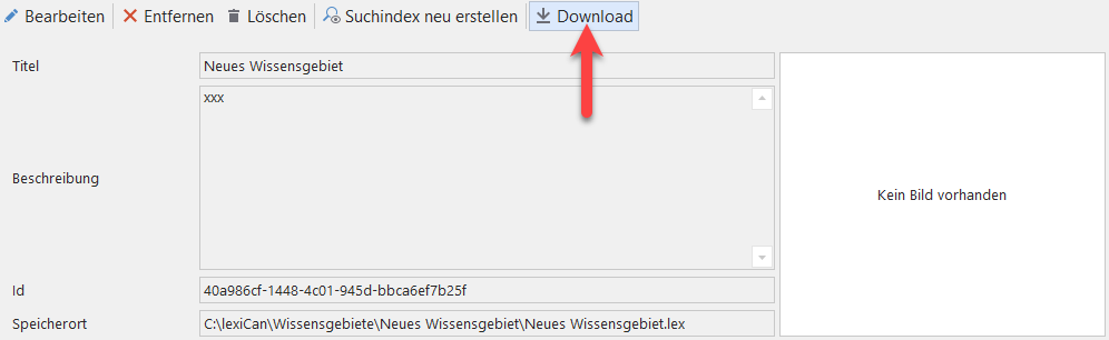Der Administrator ermöglicht es Ihnen, den kompletten Datensatz eines Wissensgebiets an einen beliebigen Speicherort zu kopieren. Diese Funktion ist insbesondere für Nutzer der lexiCan Cloud gedacht, die keinen Zugriff auf Datenverzeichnisse des Servers haben. So können Sie Ihre Wissensgebiete selbstständig auf eigene Datenträger laden/speichern. Wählen Sie das betreffende Wissensgebiet und klicken Sie auf "Download", z.B.
