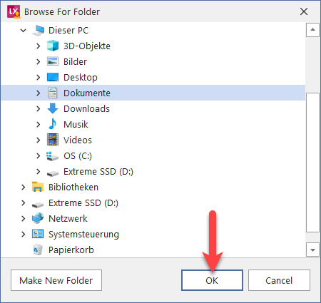 Im Dialogfenster werden Ihnen dann alle Ihre lokalen Laufwerke und externen Speichergeräte angezeigt. Wählen Sie den entsprechenden aus und bestätigen Sie über "OK". Auf Wunsch können Sie über "Neuen Ordner erstellen" auch einen neuen Dateiordner erstellen.