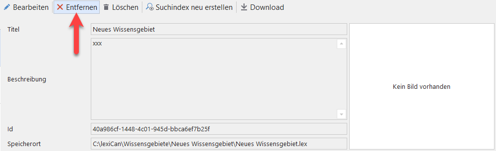 Sie können ein (aktuell) nicht genutztes Wissensgebiet inaktivieren und damit dem Zugriff der Anwender entziehen. Sie können es aber auch gänzlich aus dem System entfernen. Wählen Sie das betreffende Wissensgebiet und klicken Sie auf "Entfernen", z.B.