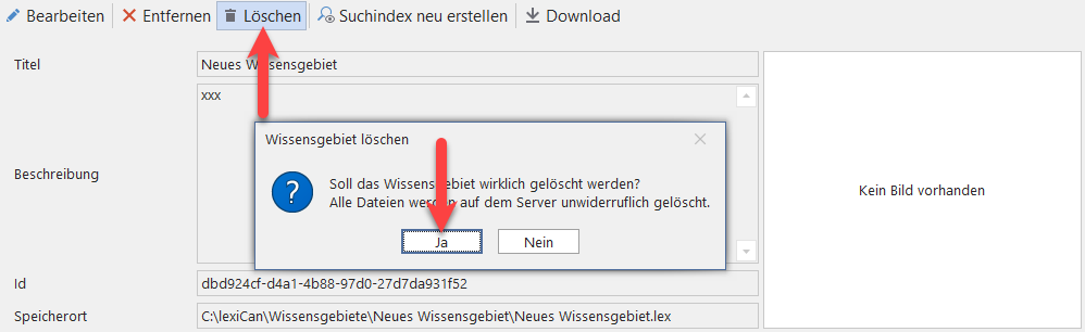 Sie können ein Wissensgebiet und alle Daten gänzlich löschen. Diese Funktion ist insbesondere für Nutzer der lexiCan Cloud gedacht, die keinen Zugriff auf Datenverzeichnisse des Servers haben. Wählen Sie das betreffende Wissensgebiet, klicken Sie auf "Löschen" und bestätigen Sie anschließend im Dialogfenster über "Ja".