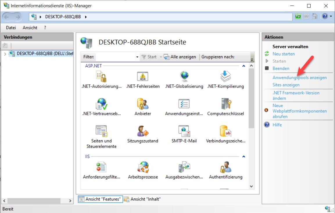 2. Starten Sie auf dem Server den IIS-Manager und klicken Sie rechts auf „Anwendungspools anzeigen“.