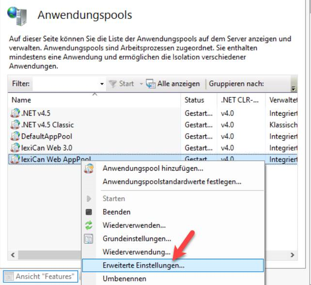 Wählen Sie mit Hilfe der rechten Maustaste „Erweiterte Einstellungen“ aus dem Kontextmenü des „lexiCan Web AppPool“.
