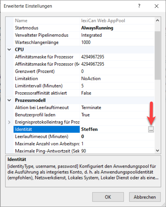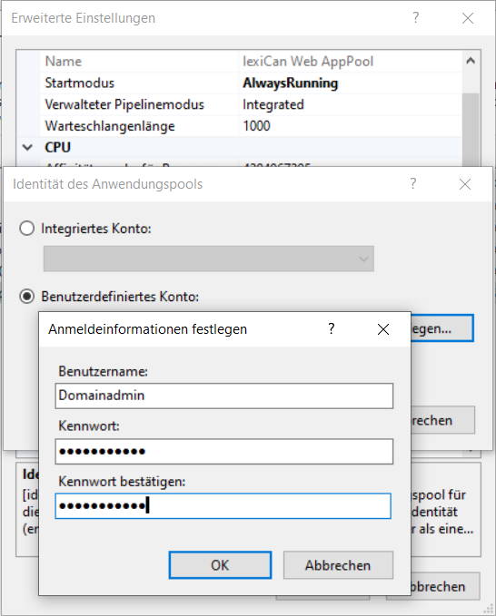 Stellen Sie die Identität der Anwendung von einem integrierten Konto (Voreinstellung) auf ein benutzerdefiniertes Konto (Domain-Konto) um. Dieses Konto muss auf die Pfade der in lexiCan genutzten Netzwerkverknüpfungen zumindest Leserechte haben. Z.B.