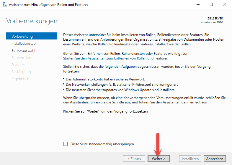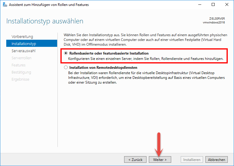 Anschließend wählen Sie "Rollenbasierte oder featurebasierte Installation" und bestätigen die Auswahl über "Weiter".