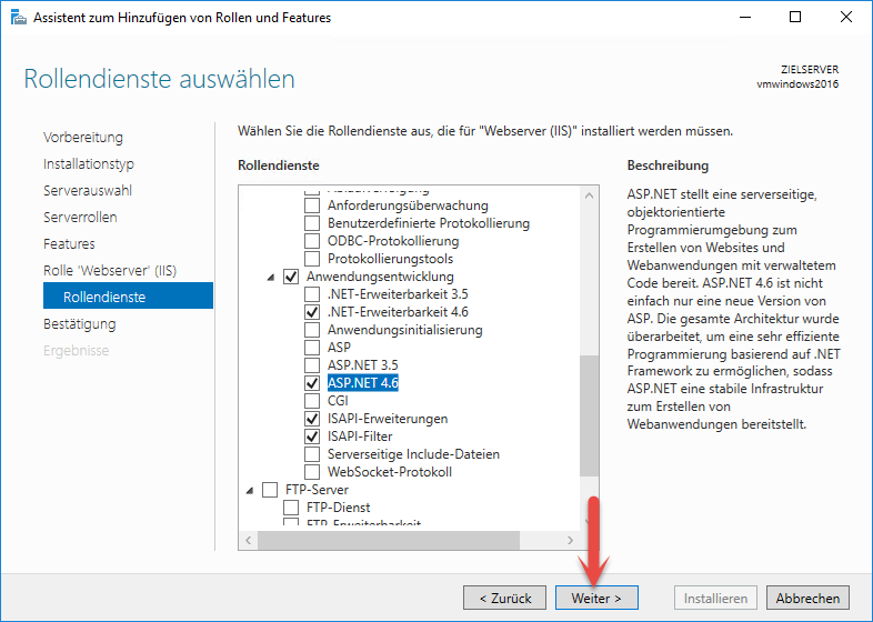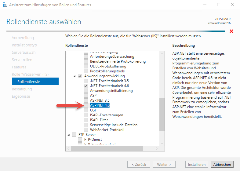 Wählen Sie anschließend im gleichen Bereich auch "ASP.NET 4.6".