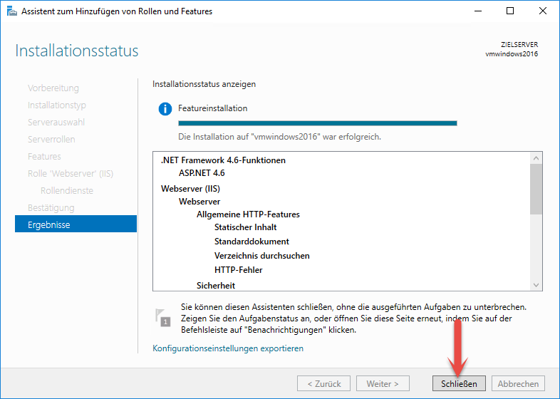 Hiermit ist die Installation der Internetinformationsdienste abgeschlossen.