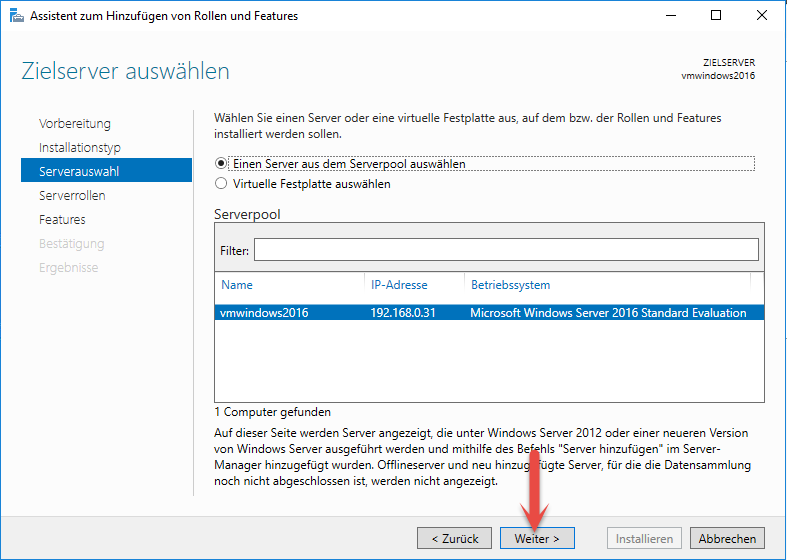 Wählen Sie in der folgenden Ansicht den betreffenden Server aus. In der Regel wird hier nur einer zur Auswahl stehen und klicken Sie auf "Weiter".
