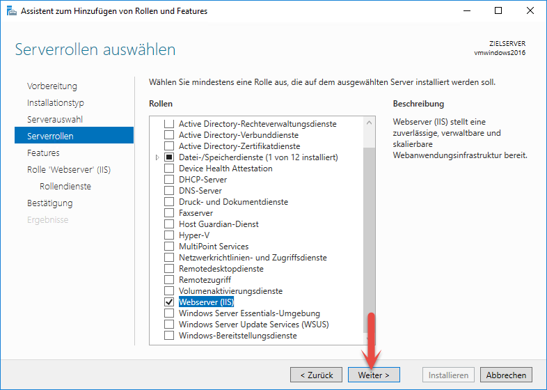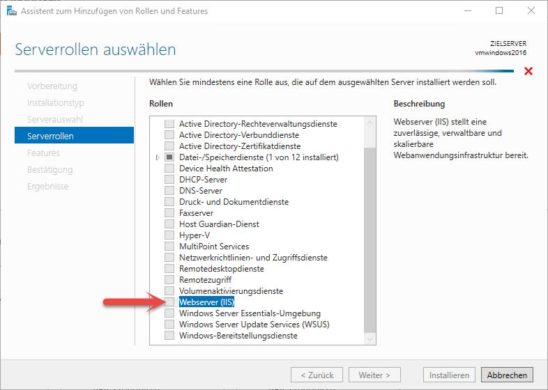 Wählen Sie unter Rollen den Eintrag "Webserver (IIS)".