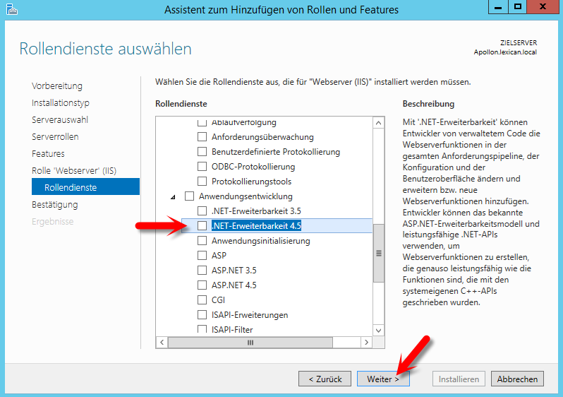 Wählen Sie dann im Bereich "Rollendienste" unter "Webserver"/"Anwendungsentwicklung" den Punkt ".NET Erweiterbarkeit 4.x".