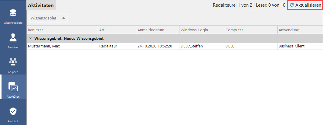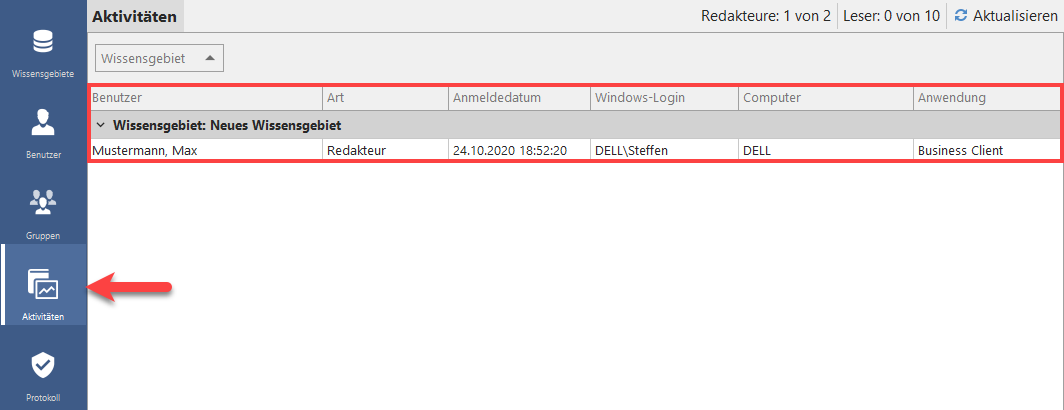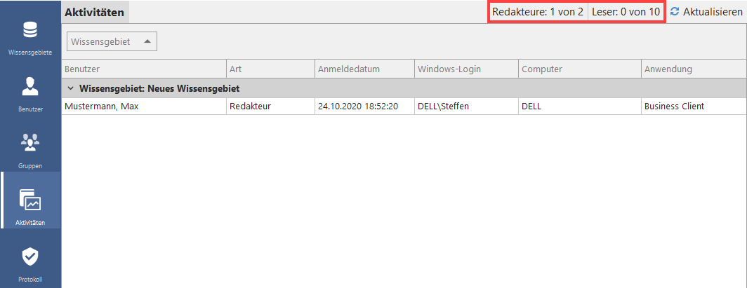 Der Administrator bietet Ihnen die Möglichkeit Informationen zur aktuellen Lizenzvergabe und Nutzung des Systems einzusehen. Klicken Sie hierzu in der Navigation auf "Aktivitäten". Es werden Ihnen daraufhin in tabellarischer Form die aktuell in Verwendung befindlichen Wissensgebiete aufgelistet und wie viele, gegebenenfalls welche Anwender mit welchen Rechten darin aktiv sind, z.B.