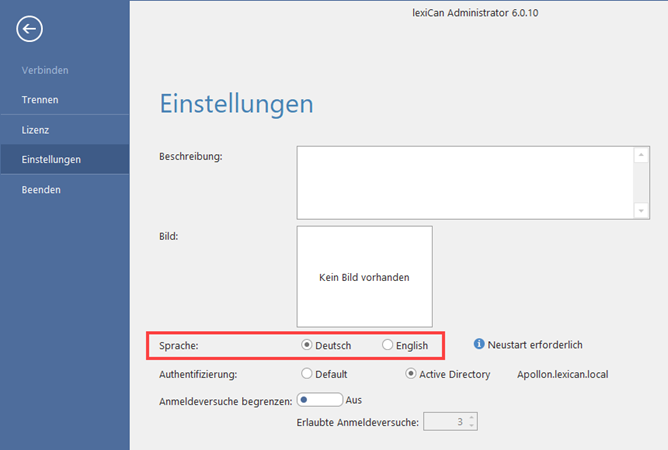 Die Programmoberfläche des Administrators steht in den Sprachen Deutsch und Englisch zur Verfügung. Die Spracheinstellung erfolgt über das Hauptmenü.