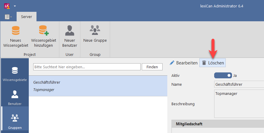 Zum Löschen einer Benutzergruppe starten Sie den Administrator, wählen Sie in der linken Navigation die betreffende Gruppe aus und klicken Sie in der Toolbar auf "Löschen", z.B.